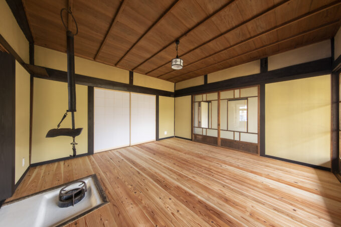 施主様が生れ育った家。その後は三千院傍という立地を活かして茶屋を運営されていた建物。たくさんの思い出が詰まった家が朽ちてしまうのは忍びないと大掛かりな改修に踏み切られました。外装は文化財指定のため意匠は変えず塗り替えや建具の新調のみ。内部はご家族や地域の方にも使ってもらいたいとお考えでゆったり広々した空間を活かしています。古い建物故、柱の足元は全てやり直し、耐力壁を新設するなど今後も健全に立ち続けられるよう工夫しています。もともと水回りは付属していなかったため、浴室・洗面所・トイレは建物内部に配置し、使い勝手にも配慮しています。天井・囲炉裏・建具・照明器具等可能な限り再利用し、かつての趣きを継承しています。南北両側にある縁側からはそれぞれ違った景色の庭が楽しめる開放的な古民家です。