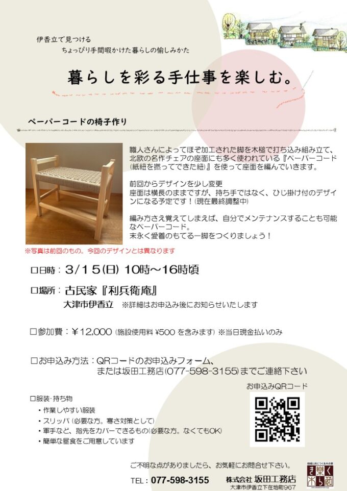 今年も手仕事はじめは3月、大人気の『ペーパーコードの椅子作り』をします!